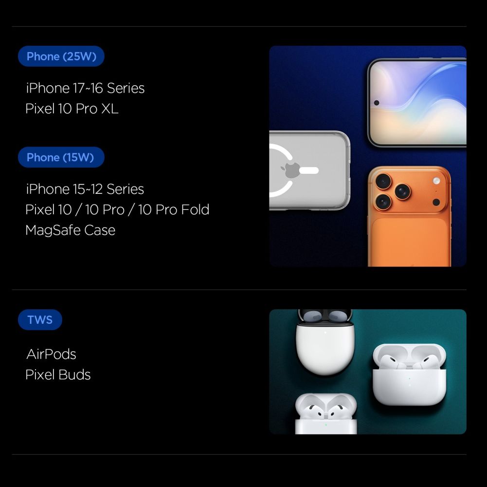 Spigen Essential EF302MOQ Qi2.2 je inovativna, kompaktna stanica za punjenje dizajnirana za maksimalnu praktičnost i učinkovitost. Podržavajući najnoviji Qi 2.2 standard, punjač nudi brzo bežično punjenje do 25 W za pametne telefone i do 5 W za bežične slušalice poput AirPodsa i Pixel Budsa, omogućujući vam istovremeno punjenje dva uređaja na jednom mjestu.